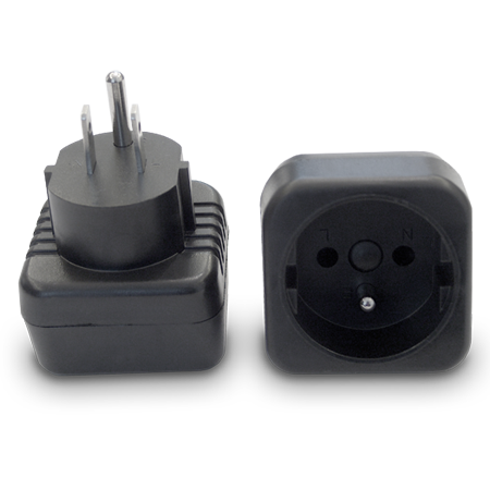 Converts a European 2 pin or Belgian/French pin-earthed plug to an American plug, so a European plug fits in an American outlet.