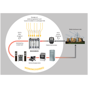 Living organisms emit energy in form of oscillations, fed by a combination of cosmic radiation and thermal energy. If this organism is inside an armoured concrete building, the vertical energy-flow is obstructed. This way, the living organism is exposed to an unnatural shortage in energy. In addition, electric wiring and devices within this room affect the spin of electrons, completely reversing the spin from left-hand to right-hand, the so-called electrosmog. These disturbing fields obstruct the vertical energy flow of the body and make it difficult for cells to share information between them. When you install a Maxiimus, it will attract vertical ions and re-create the vertical energy flow. The Maxiimus will focus the energy collected in such a dense way, that the left-hand spin of electrons is restored and disturbing electrosmog fields will be neutralised.