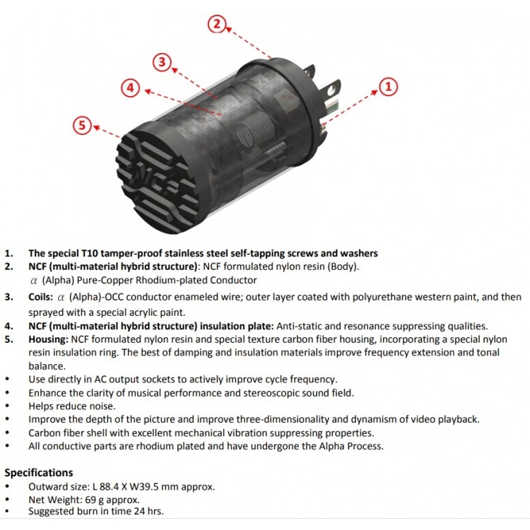 Now, Furutech has introduced perhaps the simplest way to implement NCF technology into your home. NCF Clear Line, which is an audio grade AC optimizer, small enough to hold in your hand, that instantly enhances the quality of your power supply. Its body is formed with nylon and glass fiber incorporating nano-sized ceramic particles and carbon powder for their additional “piezo electric” damping properties. It incorporates two enameled “Alpha-OCC Air” passive wire coils to improve power quality and overall system performance. For best result, use the NCF Clear Line on the same AC line/supply as your system, preferably at a receptacle adjacent to your system.
