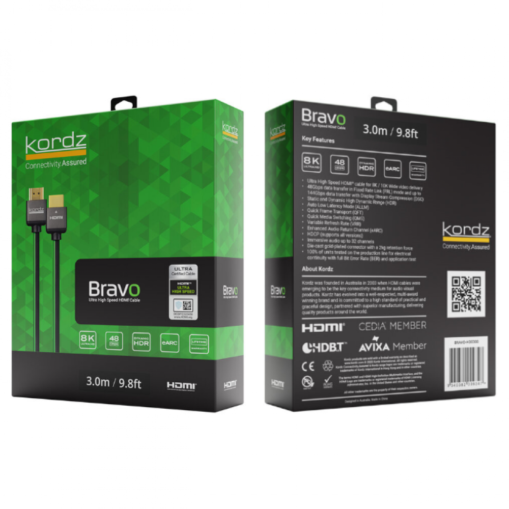 Kordz industry-leading durability now available in Ultra High Speed 8k (even up to 10k!). With Bravo, Kordz introduced an HDMI Licensing certified cable supporting all HDMI 2.1 features and built for a lifetime of consistent quality. Constructed with robust materials and next-gen technology, Bravo effortlessly carries Ultra High Speed Data signal with no interruptions and withstands the physical demands of any environment. Connectivity assured!