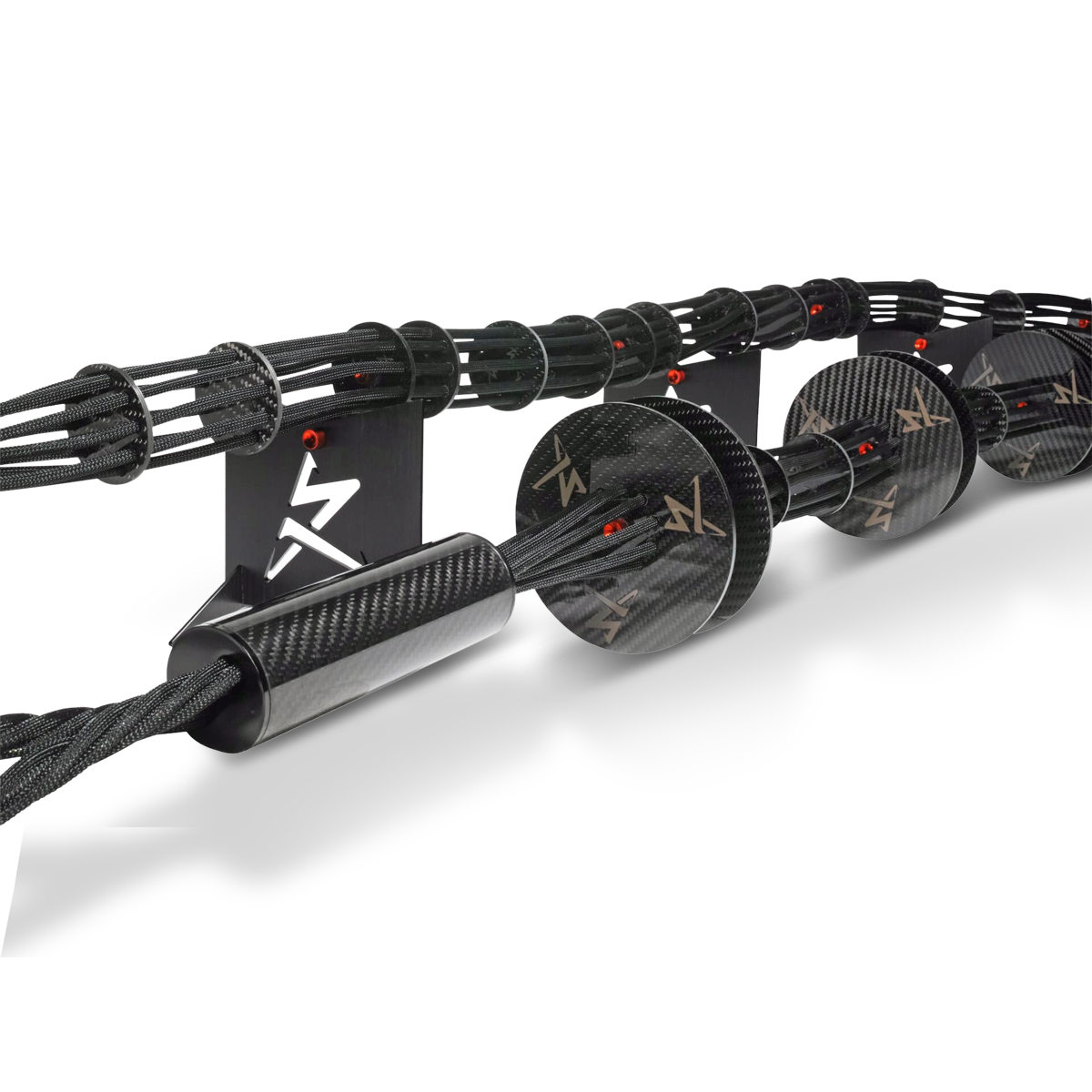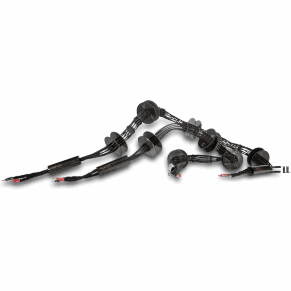 SRX Speaker Cables are an exploded geometry with ten individual pure silver cables running in parallel separated by carbon fiber discs to eliminate cross-talk between conductors. Each run has 2 x 4th Generation Tricon geometries with Silver Matrix Conductors in a Teflon dielectric, 4 x hand-made Air Strings with 14 AWG 99.9999% pure American Silver in an Air Dielectric, and 4 x hand-made Air Strings with 99.9999% Pure Silver Monofilament in an Air Dielectric.Each SRX Speaker Cable has ten parallel cable geometries for a total of twenty cable geometries per pair.