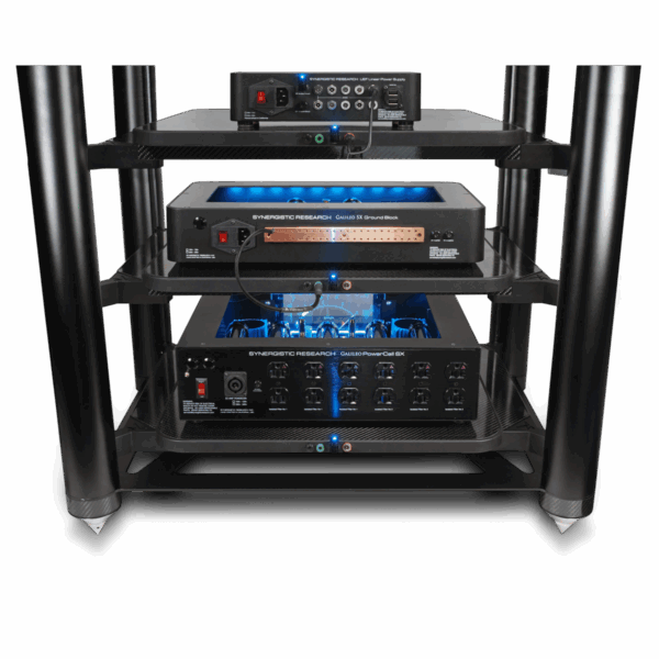 The Tranquility Rack is a perfectly orchestrated dance of materials, electromagnetic grounding and mechanical isolation to transfer unwanted mechanical resonance and EM distortion to ground. Materials were selected for their ability to break up mechanical resonance without over dampening while at the same time having the ideal conductive nature to create a uniform EM environment to drain RF noise when grounded to earth, as well as the ideal amplifier of the Earth’s Schumann resonance as generated by the Galileo Active Ground Block.